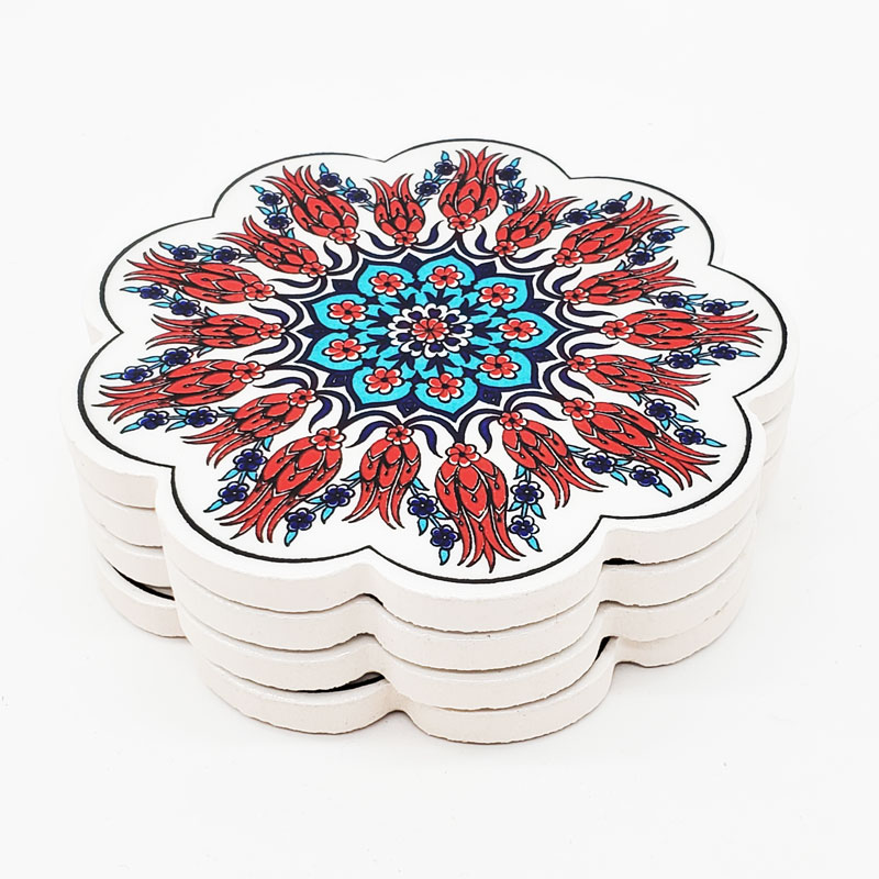 beautiful handmade 4.” diameter Ceramic Clay Coasters for entertaining and everyday use. Hand-fired at 900 degrees Fahrenheit for 12 hours, each Coaster is meticulously and intricately hand-stenciled by artisans with an abundance of vibrant colors embedded into the heat-resistant surface. The coaster is then lead-free glazed to create a beautiful, functional and unique item for any kitchen, home or office.