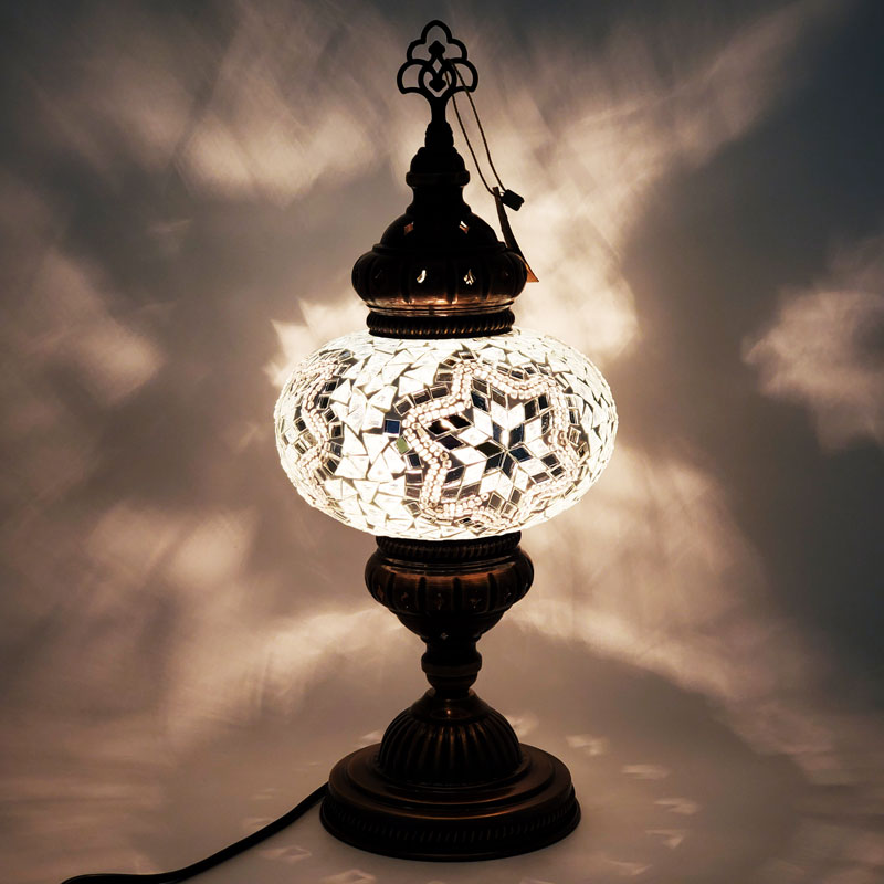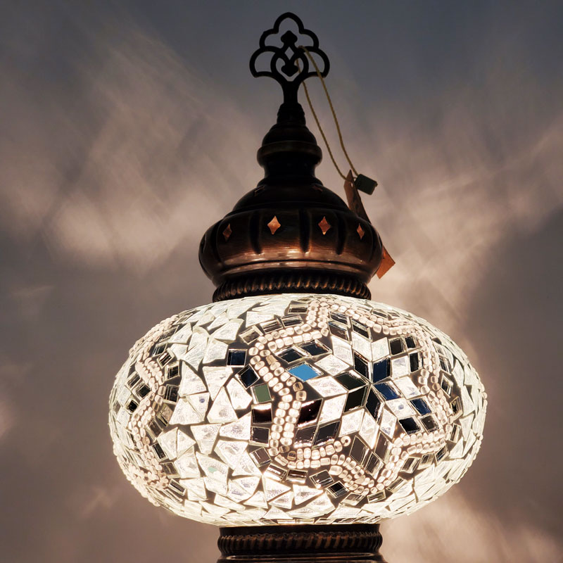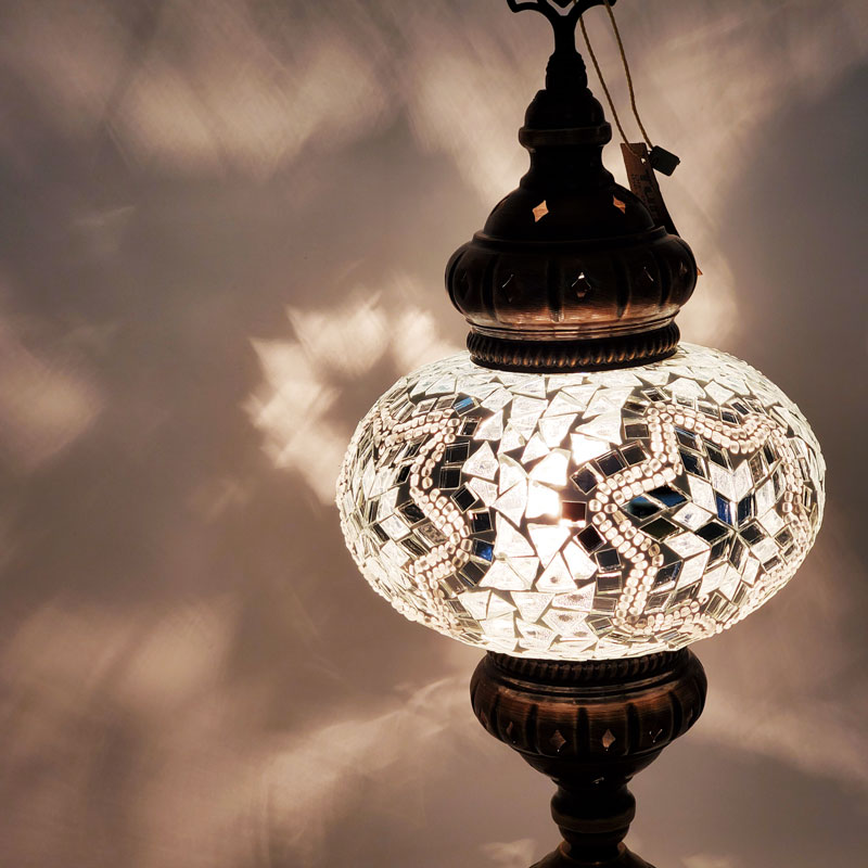 All lamps are handmade using recycled colored glass and beads.